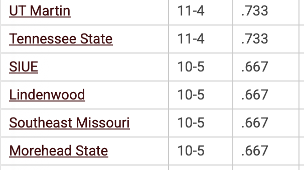 There are five games left in the regular season and these six teams are separated by one game. They all face off this Saturday. While co-leaders UT Martin and Tennessee State are on the road at SIUE and Morehead State respectively, Lindenwood is entertaining Southeast Missouri. If each home team would prevail on Saturday, there would be a five team tie for first place with four games to play.